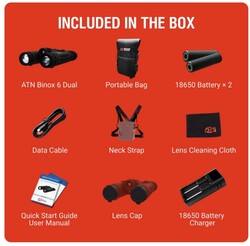 - The ATN Corp BinoX 6 is a dual multispectral binocular that combines 6th Gen thermal detection with 4K Ultra HD day, night, and twilight imaging for full-spectrum observation in any light. Built around a 256192 thermal sensor and paired with a 4K CMOS sensor, it delivers a powerful 5.544X magnification range with a 25mm objective for scanning and identification at distance. Finished in black with a built-in laser rangefinder, it includes a carry case and charging cable for ready field use.