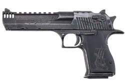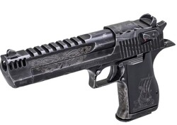 - After 25 years of being accessorized, customized and re-imagined in countless movies, television shows and video games, the Desert Eagle Pistol has emerged as a pop-culture icon. The .50AE Mark XIX has a 6-inch barrel, featuring a carbon steel frame, slide, and barrel adorned with Viking-themed engravings. It has a battle-worn finish, an integrated muzzle brake, and a black oxide finish protected by a clear Cerakote coat. The aluminum grips are laser-engraved with a Viking ship.