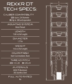 - The Rekkr DT is a direct thread suppressor, meant for higher volume shooting, with a lightweight and modular design machined from 6026-T9 Aluminum and 303 Stainless Steel, and finished with black, non-glare, Mil Spec Hard Coat Anodize. The modu- lar design allows the user to shorten the can when compactness ranks higher than suppression. The walls of the Rekkr are thicker than the Paradox to allow for maximum durability under enhanced fire schedules. The Rekkr is kept lightweight through using aluminum baffle modules in combination with 303 stainless steel baffle inserts to create a steel “core.” An integrated stainless steel muzzle brake spins gas in a way to continuously tighten the suppressor onto your muzzle. The Rekkr is perfect for those looking to add a value suppressor to their semi-automatic rifle. Step down at back of suppressor allows greater compatibility in conjunction with common AR-15 handguard inner diameters, integrated stainless steel muzzle brake acts as sacrificial baffle and allows suppressor to continuously tighten itself. Stainless steel core with gas-disrupting grooves, thicker walls for durability and heavy knurled surface for faster heat dissipation and better grip when removing or installing suppressor. Direct thread eliminates need for costly QD muzzle devices and adapters and allows for easy installation. Strategic serialization placement lessens chances of serial number destruction in case of an alignment issue causing a baffle/end cap strike