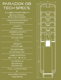 - The Paradox OB is a direct thread overbarrel sup- pressor, with a lightweight and modular design ma- chined from 6026-T9 Aluminum and 303 Stainless Steel, finished with black, non-glare, Mil Spec Hard Coat Anodize. The modular design allows the user to shorten the can when maneuverability ranks higher than suppression. The Paradox’s lightweight design is achieved through using lightweight alumi- num baffle modules in combination with 303 stain- less steel baffle inserts to create a steel “core.” An integrated stainless steel muzzle brake spins gas in a way to continuously tighten the suppressor onto your muzzle. The Paradox is a perfect light- weight and effective option for hunters. Lightweight design reduces amount of weight hunters carry in the field, Overbarrel design allows for less added length to end of rifle, Integrated stainless steel muzzle brake allows suppressor to continuously tighten itself, Stainless steel core with gas-disrupting grooves. Knurled surface for faster heat dissipation and better grip when removing or installing suppressor. Direct thread eliminates need for costly QD muzzle devices and adapters and allows for easy installation. Strategic serialization placement lessens chances of serial number destruc- tion in case of an alignment issue causing a baffle/end cap strike
