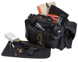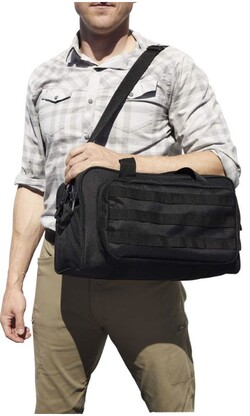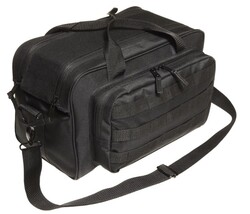 - This classic black range bag has a 15-inch x 8-inch x 8.5-inch main compartment and a 12-inch x 6-inch x 1-inch exterior pocket as well as three rows of MOLLE loops. It comes with a padded pistol rug and a detachable shoulder strap.