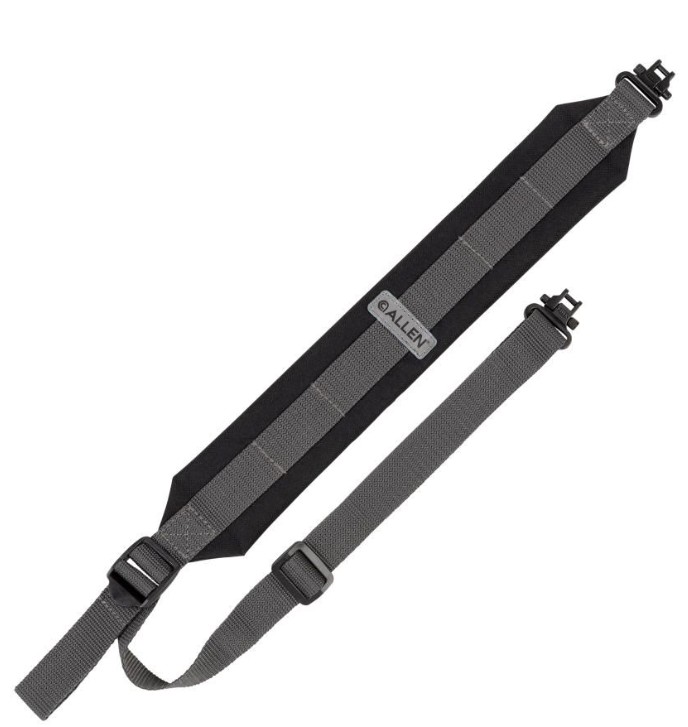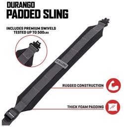 - Upgrade your shooting experience with the Allen Company Durango Endura Rifle Sling, designed for durability and comfort. Featuring a rugged construction and thick foam padding, this sling provides reliable support and comfort during extended use. The included premium swivels are tested to withstand up to 500 pounds, ensuring a secure and stable attachment to your firearm. With its sleek black and gray design, this sling is both functional and stylish, making it an essential accessory for any rifle owner.