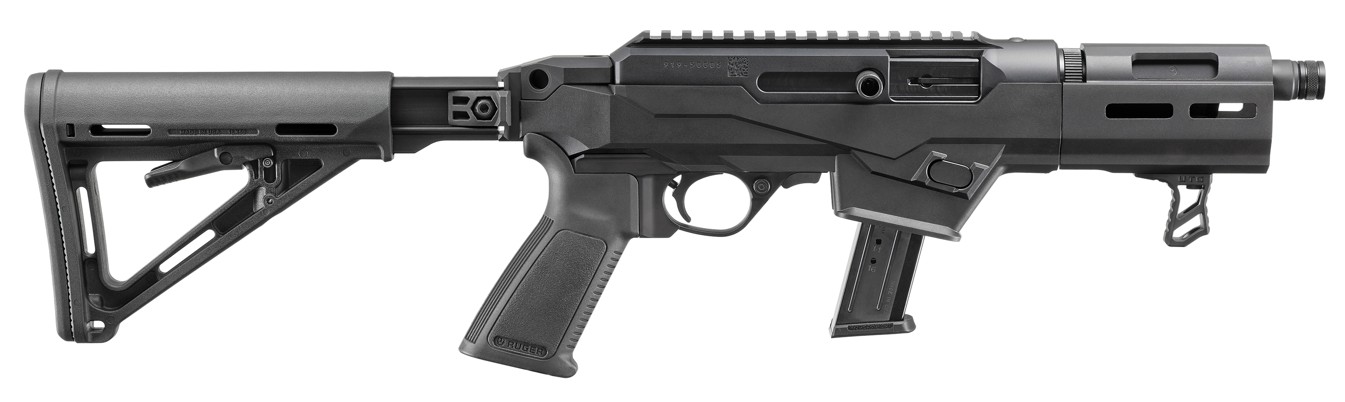 - The PC Carbine SBR features a black synthetic chassis, a black Magpul® stock adjustable for length-of-pull, and an aluminum free-float handguard with a removable M-LOK® hand stop – all combining to deliver superior control and a customizable fit for any shooter. Its cold hammer-forged, 6.5-inch barrel is threaded 1/2"-28 and includes a thread protector. This model ships with the SR-Series™/Security-9® pistol magazine well installed, along with one 17-round SR-Series or Security-9 9mm magazine, and includes an additional magazine well that accepts most double-stack Glock®-pattern magazines.
